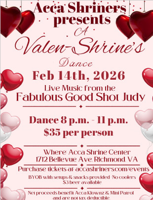 Acca Shrine Center 1712 Bellevue Ave., Richmond, United StatesAcca Shriner's Valen-Shrine's Dance - Featuring Good Shot Judy - 8 PM - 11 PM - $35 per person BYOB - Setups & Snacks Provided Tickets: Click Here