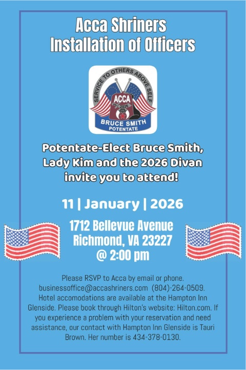 Acca Shriners Installation of Officers Potentate-Elect Bruce Smith, Lady Kim and the 2026 Divan invite you to attend. Please RSVP to Acca by email or phone businessoffice@accashriners.com (804-264-0509) Hotel accommodations are available at the Hampton Inn, Glenside - Please book through Hilton's website: Hilton.com