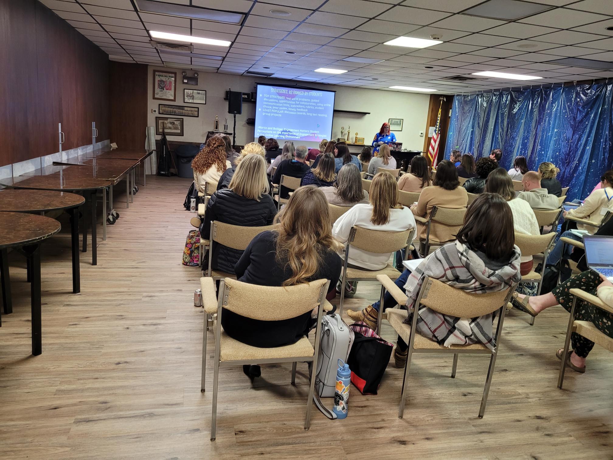 "description": "Medium-sized space well suited for meetings and presentations of 100 or more guests. Includes a raised stage and sound equipment.",