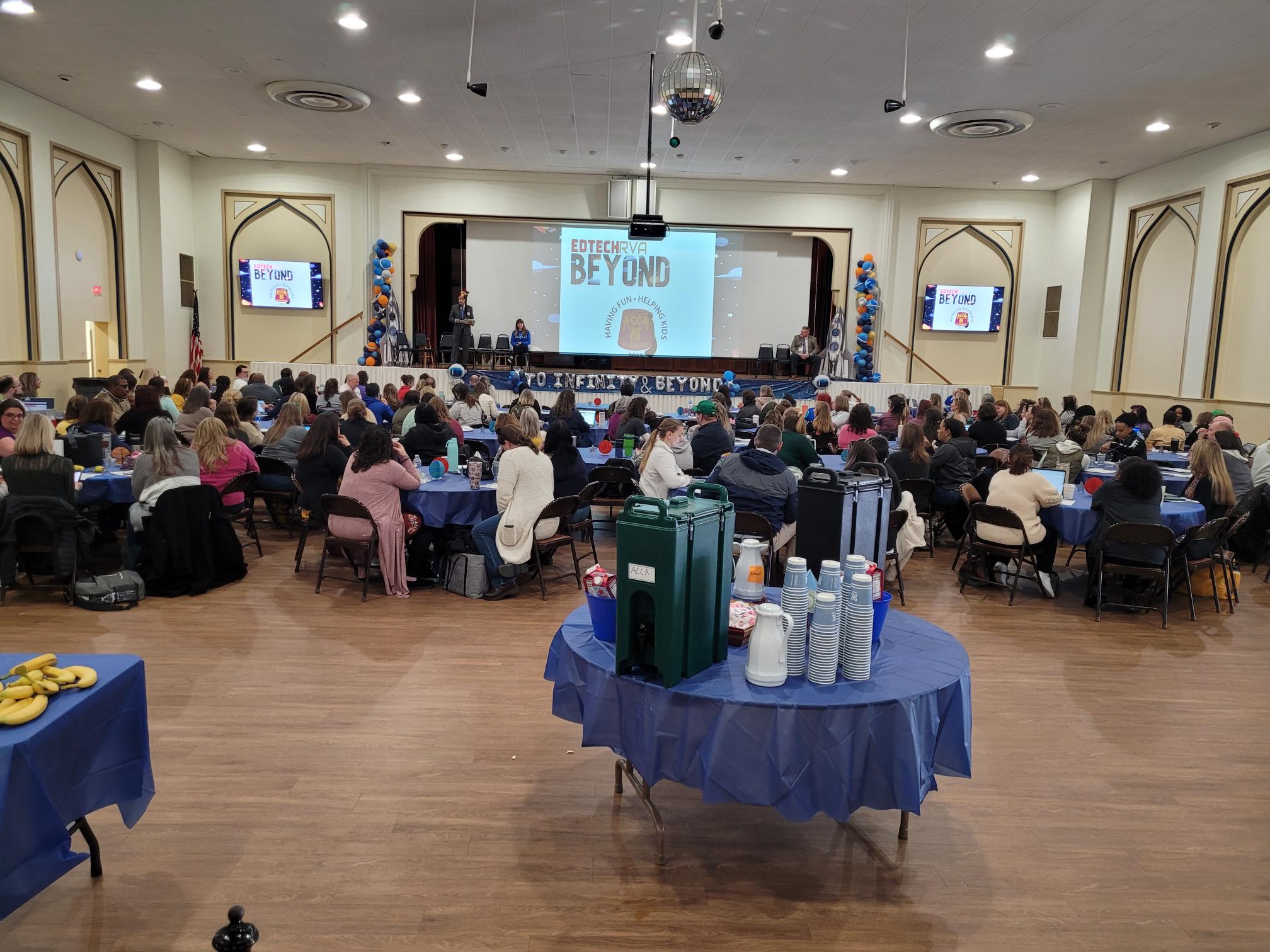 "description": "Traditional ballroom that comfortably seats approximately 300 guests with room for dancing, or up to 600 for larger events. Includes a curtained stage, two large television screens, wireless microphones, and access to a full kitchen.",